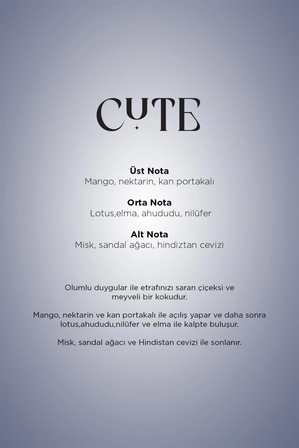 Carpex Cute Classic Aroma, meyveli notaların canlılığı ile çiçeksi esintilerin zarafetini bir araya getirir. İlk nefeste mango ve kan portakalı ile enerjik bir açılış sunar; ardından lotus, ahududu ve nilüfer ile iç açıcı bir tazelik hissi bırakır. Son dokunuşta misk, sandal ağacı ve hindistan cevizi yumuşak bir sıcaklık katar.