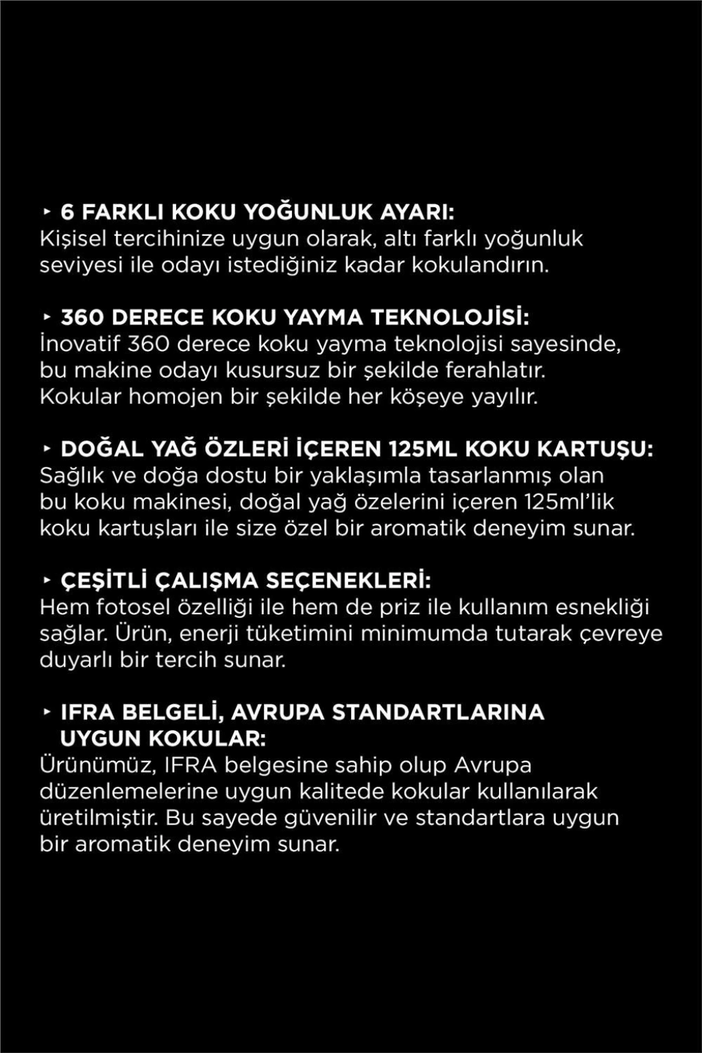 - Teknoloji: Gelişmiş soğuk difüzyon sistemi ile homojen koku yayılımı