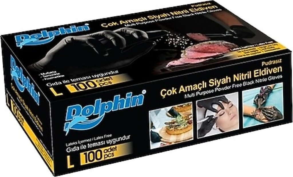 Dolphin Siyah Nitril Eldiven, MDR sertifikalı, lateks içermeyen, dayanıklı ve esnek bir üründür. Mutfakta, temizlikte, kozmetikte ve medikal alanlarda güvenle kullanılabilir.
