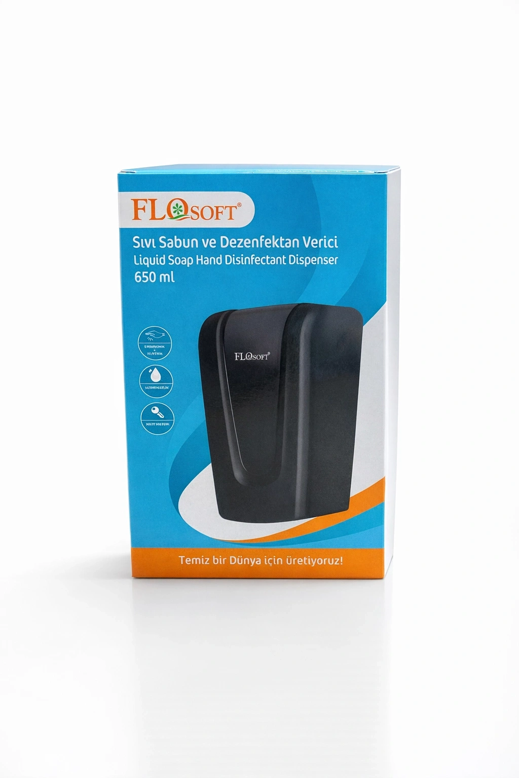 • Flosoft sıvı sabunluk 650 mililitrelik kapasitesiyle lavabo tipi olarak üretilmiştir.